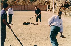 Billarda: This game is played in two teams of two people. Each has a stick of about a metre long and the billarda is a fifteen-centimetre-long piece of wood. The playing field is demarcated between two horseshoe-shaped goals that are ten steps away from each other. Each player is paired with an opponent and stands in the goal. Therefore, each goal has one defence and one attacker; you have to throw the stick and, if you hit the billarda, you have to run with your partner back and forth from goal to goal. The match ends whenever a team gets twelve points.