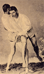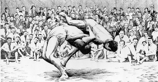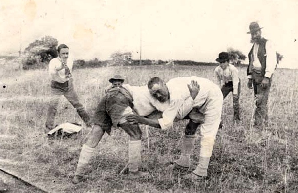 Canarian Wrestling: Wrestling was common during celebrations, but its customs and rules are not exactly known today, thus we cannot be sure if its structure is similar to that of modern Canarian wrestling. In this sport, two adversaries face each other, crouching slightly and holding the cuff of their opponent’s shorts; their goal is to force the other to lose their balance and touch the ground with any body part other than the sole of their feet, all while staying in a circle and in less than one and a half minute. To achieve this, a series of different techniques can be used, but it is forbidden to hit the adversary. It can be done in groups, individually, classified by weights, categories, challenges, et cetera. The most common version involves teams of twelve wrestlers facing each other individually.