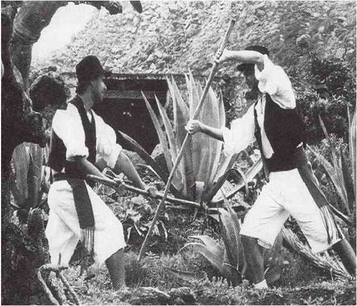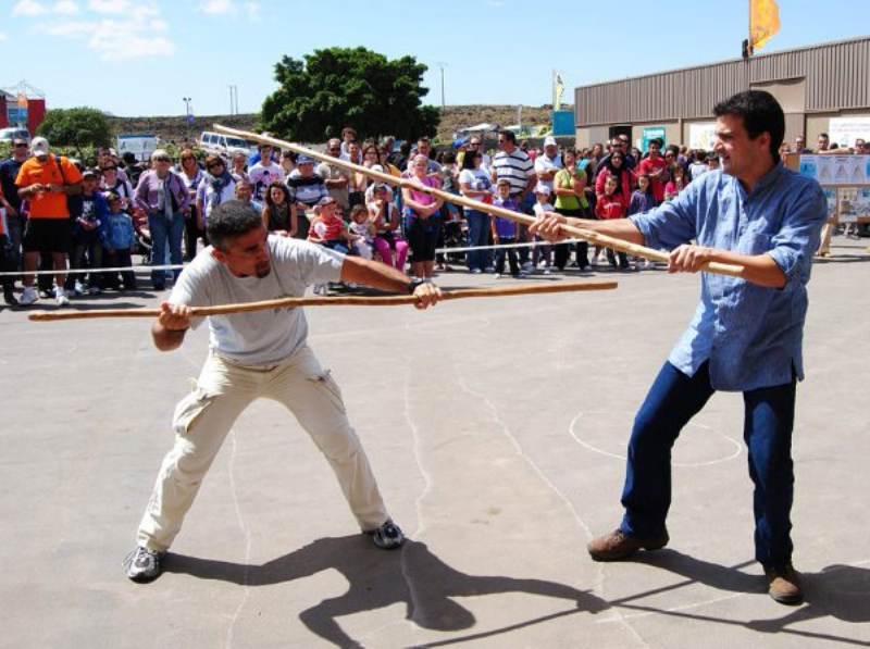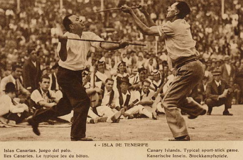 Juego del palo: This sport is the result of warfare developments, and it is basically fencing with thick wooden sticks instead of swords. The first records about this game are dated all the way back to 1402, in Jean de Bethencourt’s chronicles, where he wrote about the people of the island of El Hierro, who carried spears without an iron head. The sticks can be short, medium or long in length: the short ones reach from the ground to the hand, the medium one to either the heart or the chin, and the long one is taller than the user, being able to reach anywhere between two and four metres in length. They were usually made out of different types of wood, like juniper, palo blanco (Picconia excelsa), olive, Visnea mocanera, tamarisk, holly, almond, quince, et cetera. The short stick is thick, while the medium one has two parts: the trozo (where it is held) and the punta (the point); the long stick has a uniform thickness. The best players barely move from their place, using a series of effective techniques and changing their movements so their adversaries cannot predict their next move.