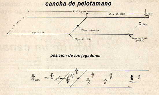 Pelotamano: A derivation of French jeu de paume that can still be found today. This game arrived to the Canary Islands somewhere around 1402, during the expedition of Jean de Bethencourt and his court. The first records of this game can be found in Teguise, from a 1616 document that mentions the sale of some houses located near a playing field. It consists in throwing the ball back to the other team by hitting it with the hand before it bounces twice or stopping it with a hand or foot. The team must gain the opponent’s ground by marking where the ball was sent from each time. The playing ground is long, only limited sideways; on the back, there are two stones called cabo de bote and the distance between them makes an imaginary line that limits the sides of the field. Its dimensions are usually sixty to seventy steps long front to back and eight to nine steps from side to side. The punctuation is marked by fouls or puntos y rayas (points and lines). When all the points have been scored in a game, they count as one chico; five chicos make a pajero. It is usually played in teams of five players, but it can also be played by teams of four or six players.