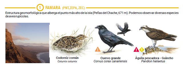 - FAMARA (PNT, ZEPA, ZEC): tructure géomorphologique où se trouve le point plus haut de l’île (Peñas del Chache, 671 mètres). On peut observer des différentes espèces d’oiseaux rocailleux, comme la Caille commune (Coturnix coturnix), le grand Corbeau (Corvus corax canariensis) et le Balbuzard pêcheur ou le Guincho (Pandion haliaetus).