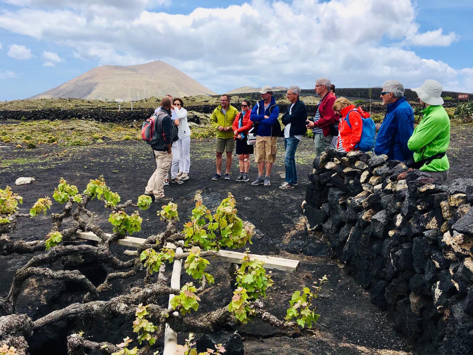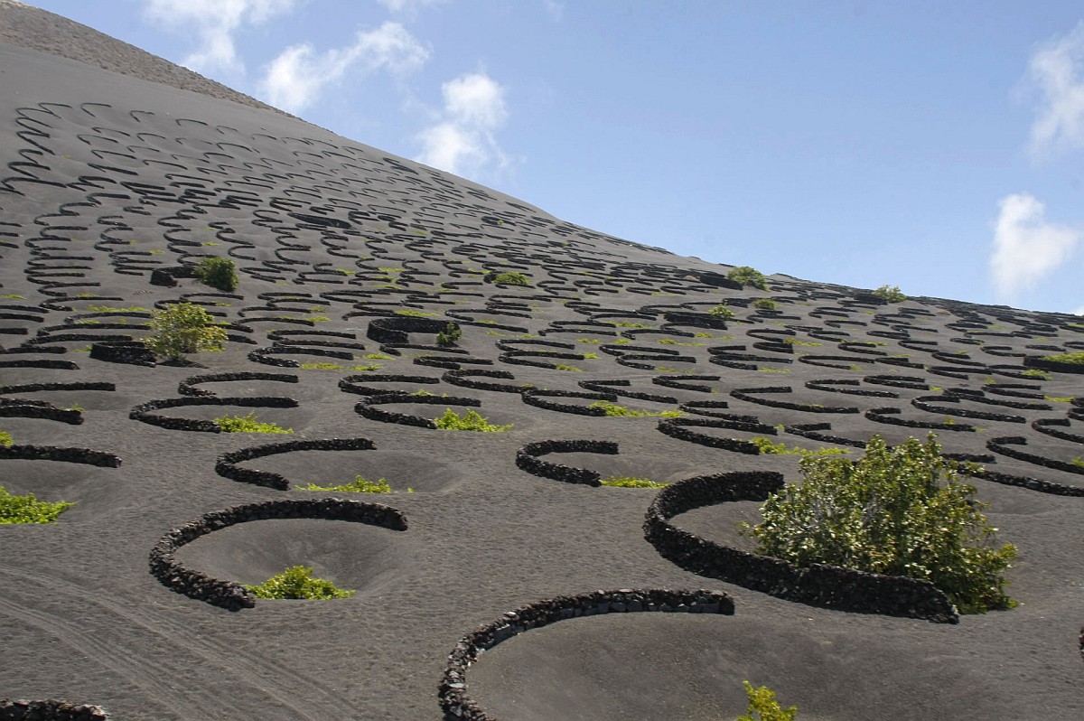 Además del origen volcánico de los suelos, La Geria se caracteriza por un representativo paisaje agrícola labrado por la mano del hombre. Algunos viñedos se encuentran enterrados en profundos hoyos o en zanjas, que se protegen del incesante viento con muros de piedra semicirculares. Este sistema de plantación no permite la introducción de maquinaria para el cultivo, por lo que el mantenimiento de la vid se realiza de forma manual. Una labor heroica desarrollada por los viticultores de La Geria.